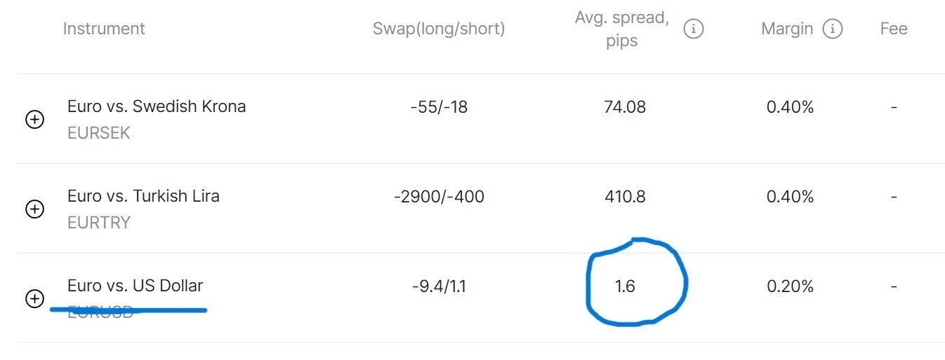لتقييم الفروقات بين وسطاء الفوركس، يكفي أن نلقي نظرة على فروقات أحد الأصول الرئيسية مثل زوج العملات اليورو/الدولار الأمريكي. لدي متوسط فروقات بقيمة 1.6 نقطة على منصة NAGA. وهذه قيمة مربحة.