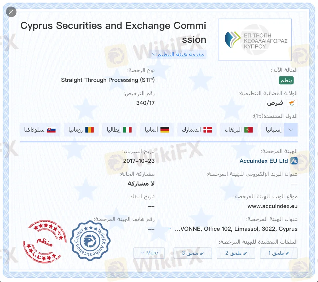 يعد اسم AccuIndex معروفاً في صناعة التداول عبر الإنترنت، حيث يعمل بشكل قانوني تحت رقابة هيئة الأوراق المالية والبورصات القبرصية (CySEC). مع درجة تقييم WikiFX البالغة 5.71/10، يُظهر الوسيط هيكلاً مؤسسياً شرعياً ودرجات عالية في موثوقية البرمجيات.