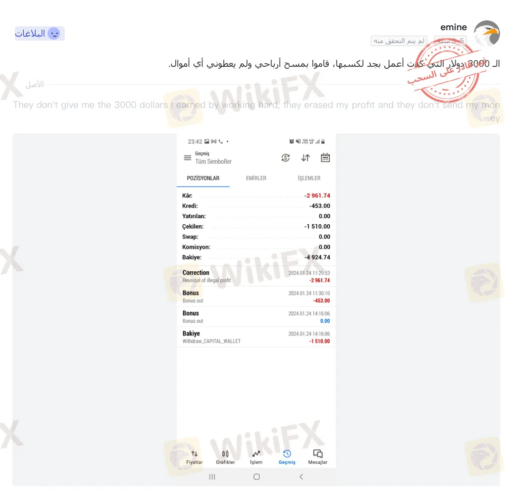 النمط الأكثر إثارة للقلق يتعلق بالعديد من المتداولين الذين أبلغوا عن مسح أرباحهم بعد جلسات تداول ناجحة. شارك العديد من المستخدمين لقطات شاشة تظهر تعديلات في الرصيد تحت مسمى “تصحيح: عكس أرباح غير قانونية” أو “عكس الربح غير القانوني”. في إحدى الحالات، ادعى متداول أنه ربح ما يقرب من 3,000 دولار من خلال العمل الجاد، ليفاجأ بخصم المبلغ بالكامل ورفض السحب.