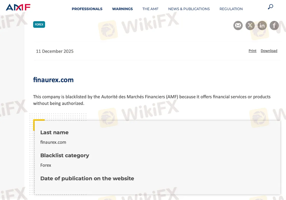 في 11 ديسمبر 2025، قامت الهيئة الفرنسية للأسواق المالية Autorité des Marchés Financiers المعروفة اختصارًا بـ AMF بإدراج موقع finaurex.com رسميًا في قائمتها السوداء العامة، محذّرة من أن المنصة كانت تقدم خدمات تداول الفوركس في فرنسا دون أي ترخيص قانوني.