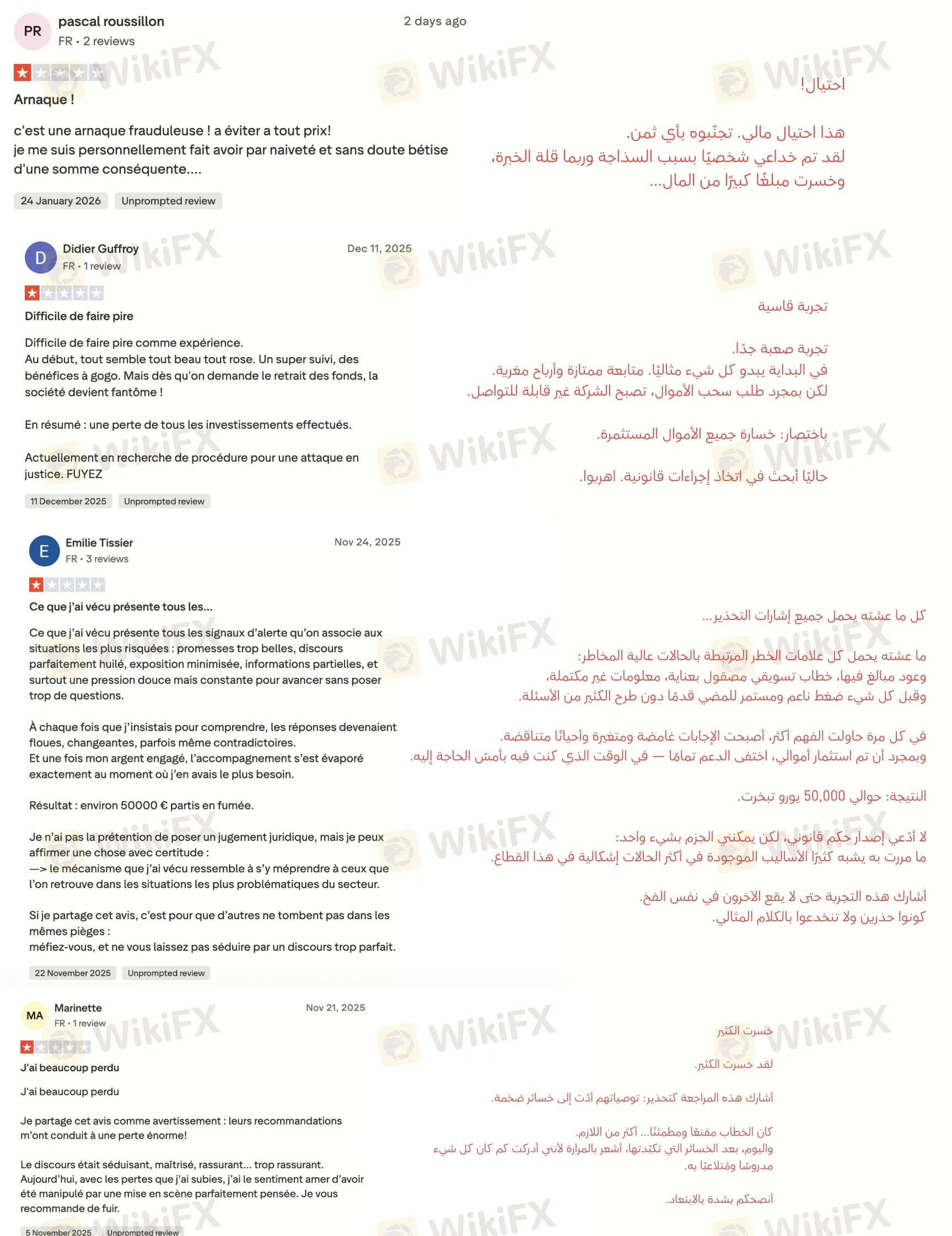 إلى جانب التحذيرات التنظيمية، شارك عدد من المستخدمين الناطقين بالفرنسية تجارب مقلقة بعد إيداع أموالهم في Finaurex. وقد وصف عدة مستخدمين نمطًا متشابهًا: