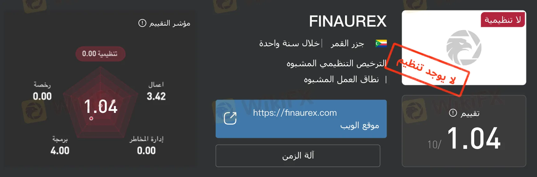 وفقًا لبيانات WikiFX، لا يظهر أن Finaurex تمتلك حاليًا أي ترخيص تنظيمي صالح، كما أن التقييم التنظيمي للمنصة مسجّل عند 0.00، ما يشير إلى عدم خضوع أنشطة التداول لأي جهة رقابية مالية معترف بها.