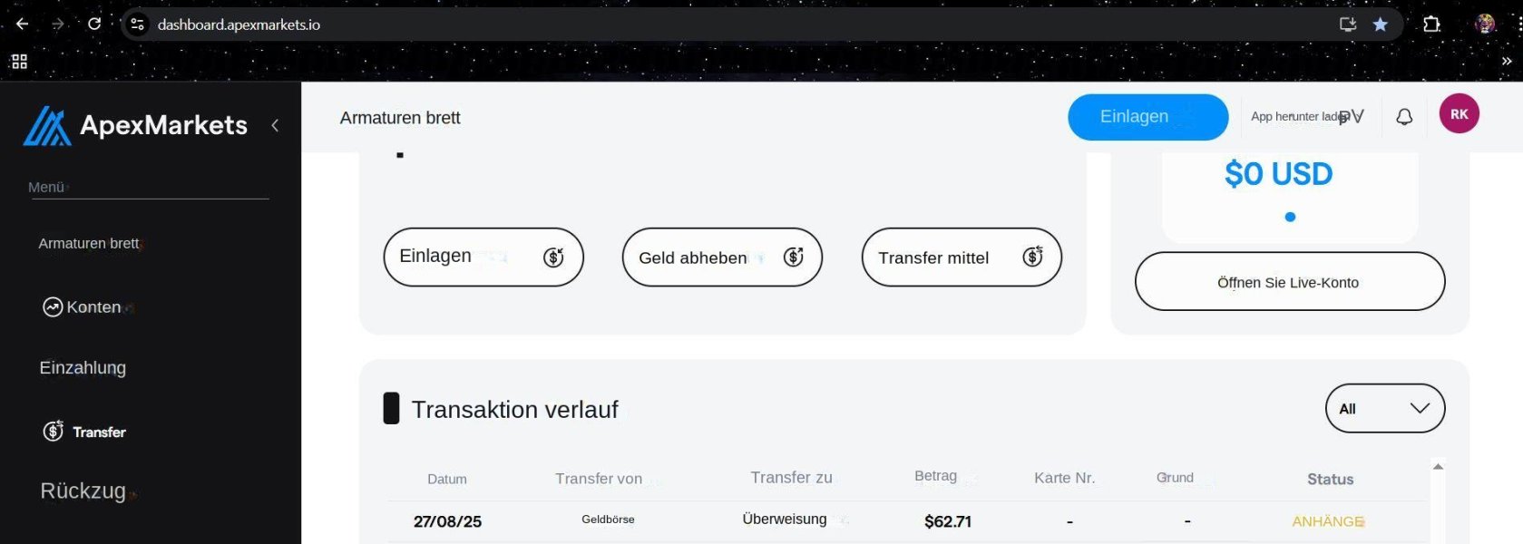 Ich habe am 27. August 2025 eine Auszahlung per Überweisung beantragt, und sie wird immer noch als AUSSTEHEND markiert. Über einen Monat ist vergangen, und es gab keine Kommunikation oder Maßnahmen vom Support. Das ist völlig inakzeptabel und unprofessionell. Ich rate dringend zur Vorsicht bei der Nutzung dieses Dienstes.