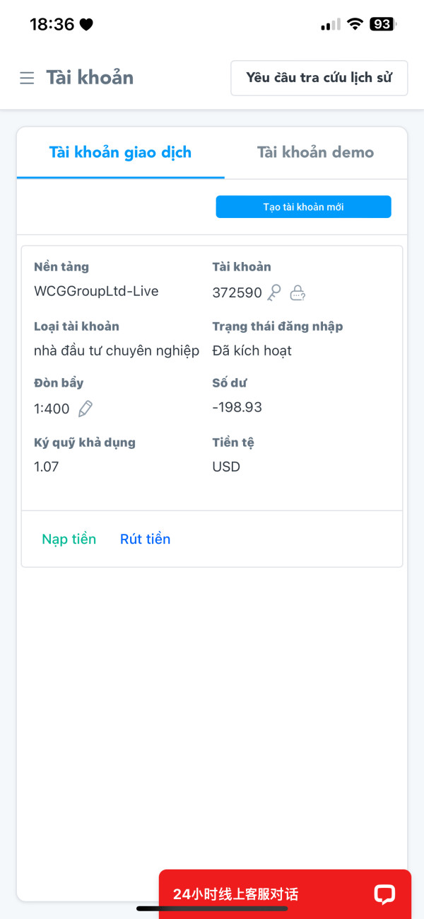 Tôi đã tải vào nền tảng WCGGroupLtd-Tài khoản trực tiếp 372590 18000USD sau đó không thể rút và mất sạch số tiền trong tài khoản