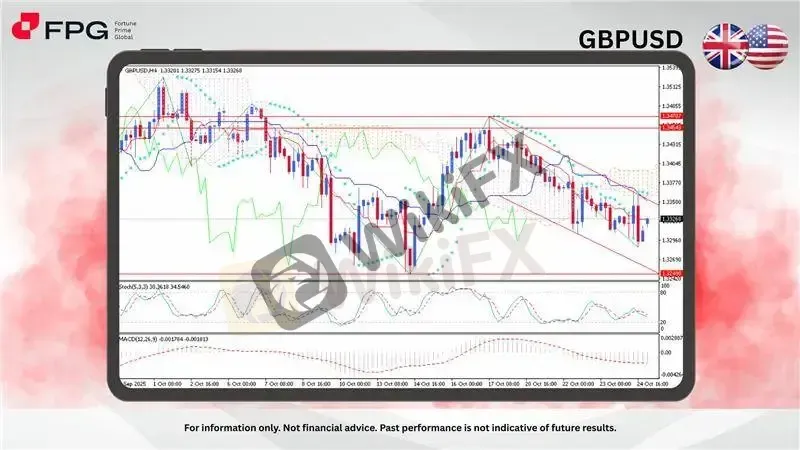 Zusammenfassung:The GBP/USD pair on the H4 timeframe continues to move within a bearish channel, reflecting sustained downward momentum from recent sessions. The price is currently around 1.3326, facing immediate res