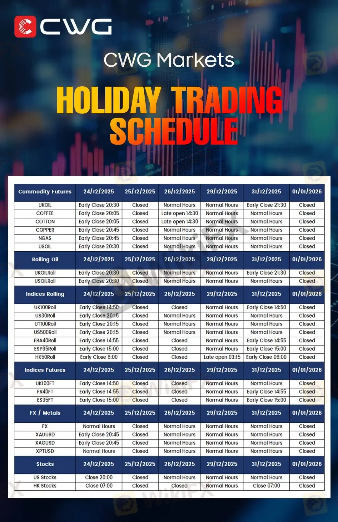 CWG MARKETS - Holiday Trading Schedule