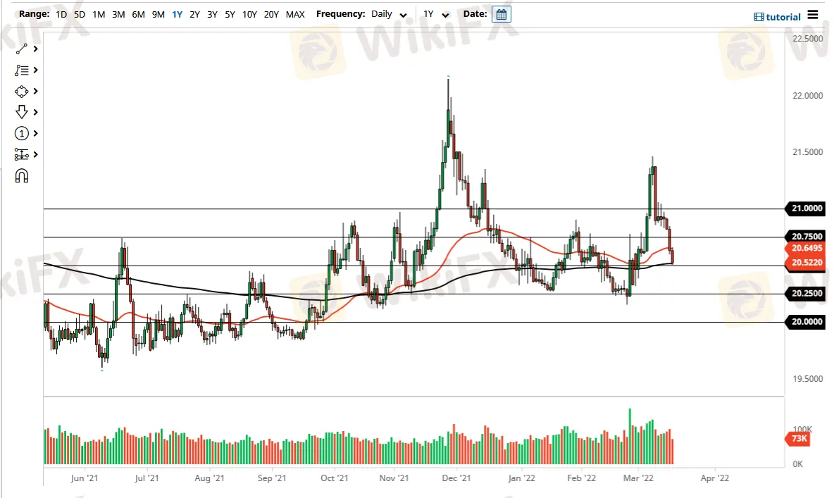 If we break down below the 20.50 pesos level, then it is likely that we will then reach the 20.25 pesos level. That is an area that has been support a couple of times, and with even the site of a double bottom previously, so that should be an area of significant demand. Anything below there would open up the trapdoor for a move down to the 20 pesos level.
