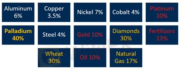 RUSSIAS PERCENTAGE SHARE OF KEY GLOBAL COMMODITY PRODUCTION IN 2021