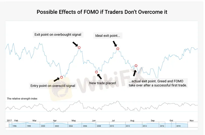 This chart illustrates what can happen if traders get carried away by FOMO. It uses the Relative Strength Index as an indicator, showing when the Japanese Yen has been overbought or oversold. The second set of arrows illustrates a situation where the trader has become overconfident, and is worried about missing out on another opportunity. In their excitement, greed and fear of missing out take over – the trader ignores signals to sell in the hope of getting a bigger win, and ends up making a loss.