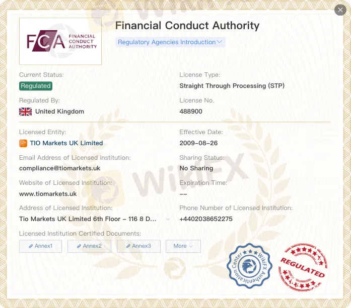 Yes. TIO Markets UK Ltd is FCA‑regulated in the UK, license no. 488900.