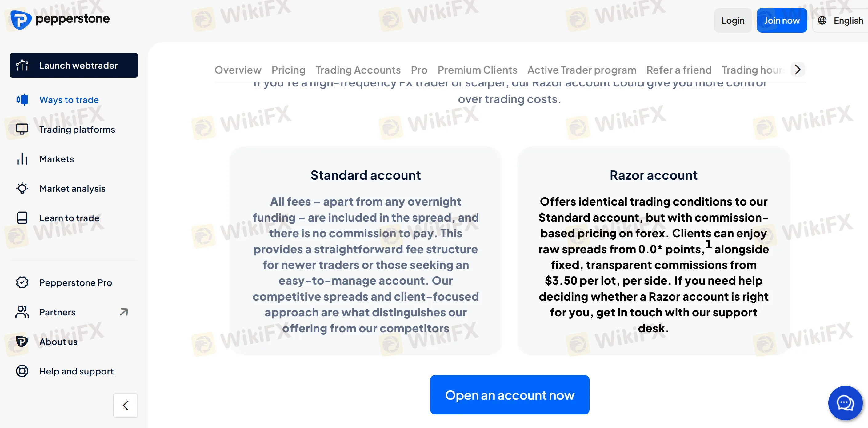 Two core CFD accounts are available. Standard prices via spread-only (no FX commission). Razor offers raw spreads plus a per-lot commission. Product availability and leverage limits depend on the clients onboarding entity and classification.