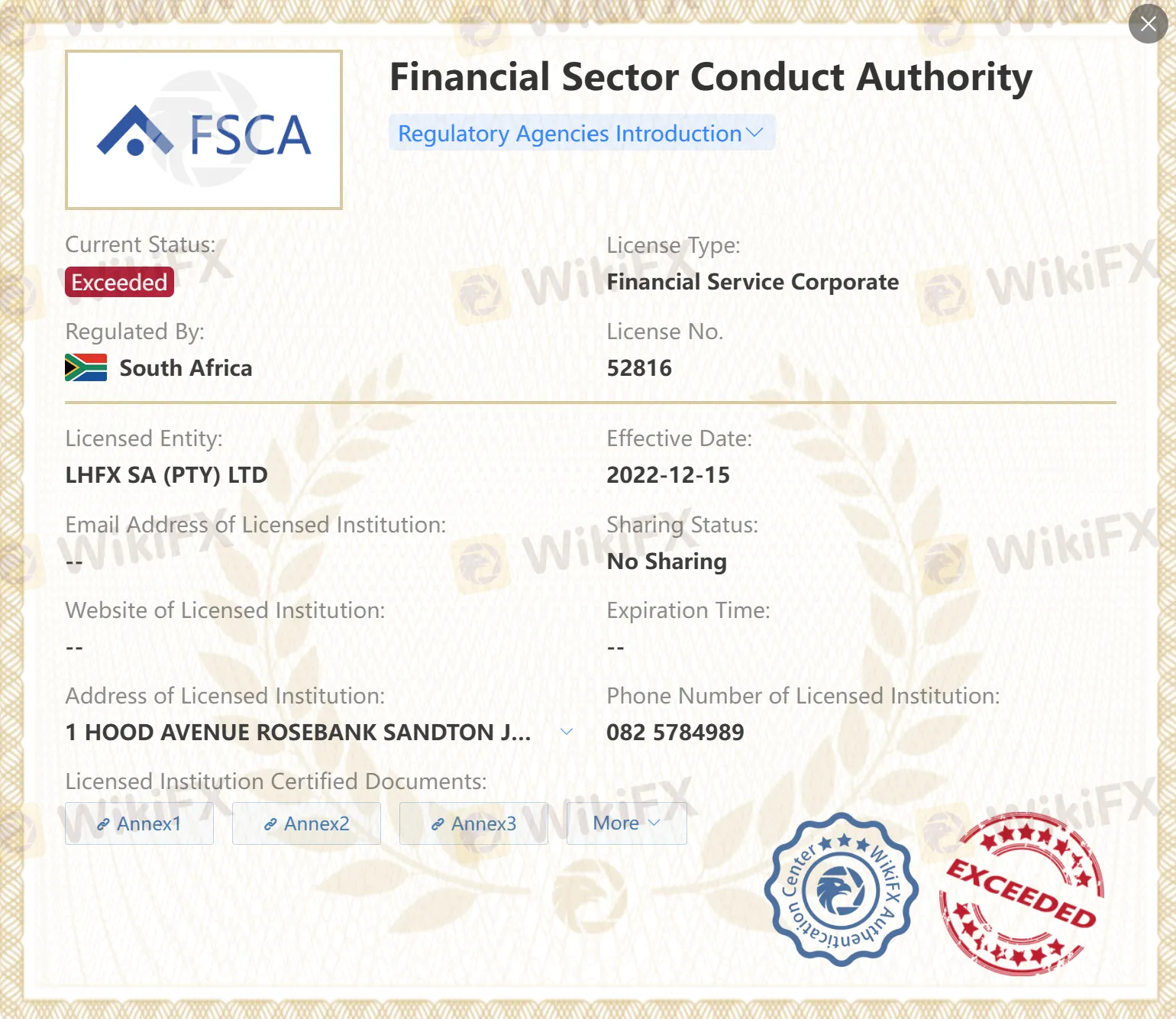 | South Africa | FSCA | LHFX SA (PTY) LTD | Financial Service Corporate | 52816 | Exceeded |