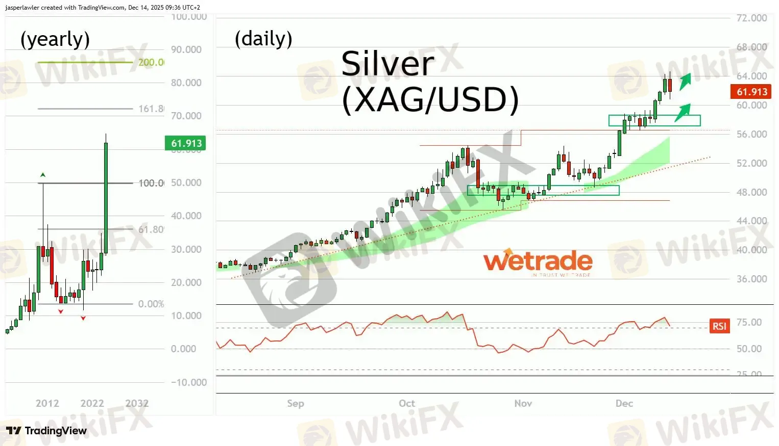 - Yearly candle chart shows 161.8% Fibonacci extension targets over $70