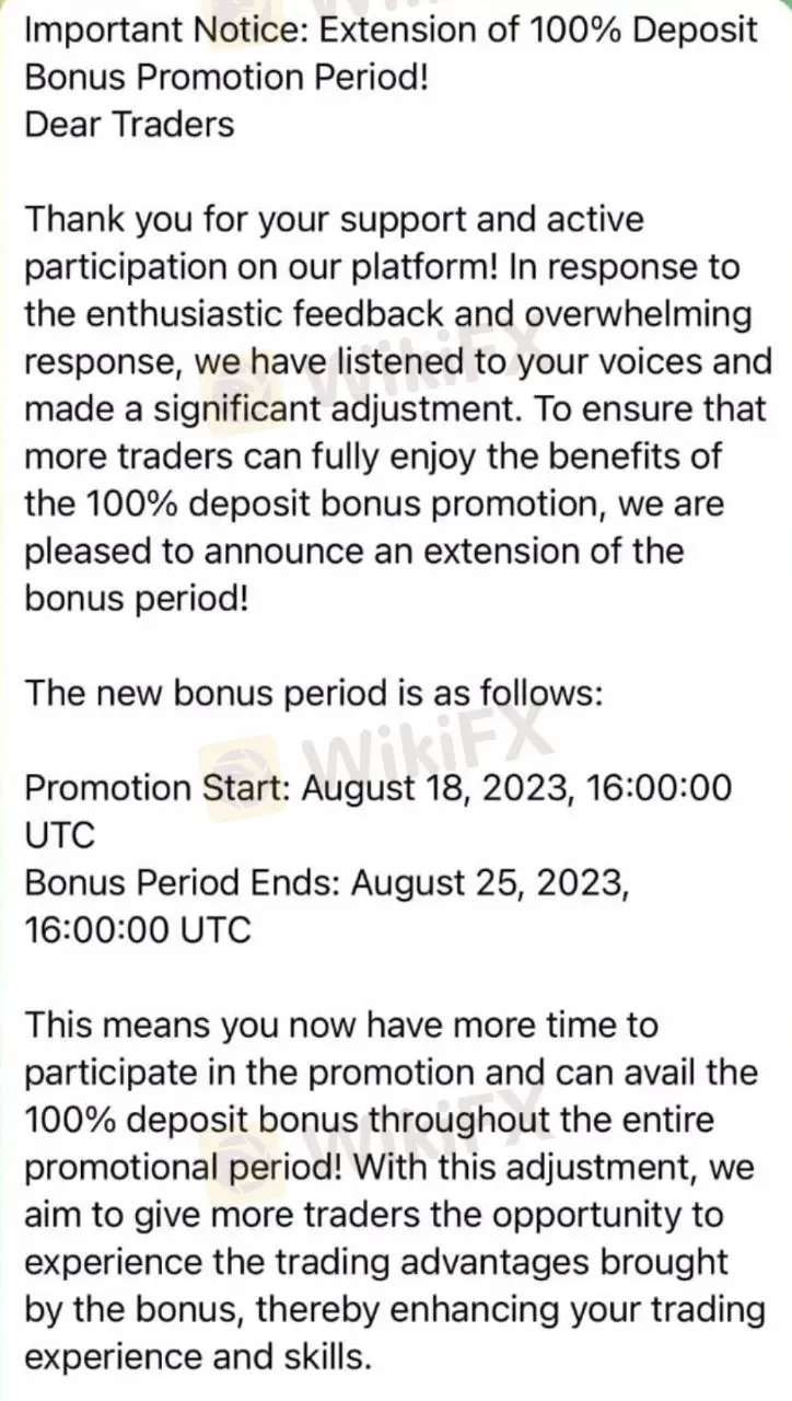 Luego de la promoción del Bono del 100% sobre el depósito, BlaFX lanzó a través de sus canales de Telegram una segunda promoción de una manera más directa y personal a sus clientes en la que se les prometía una bonificación extra dependiendo de la cantidad de dinero que ingresaran a las cuentas ese día de manera inmediata. En dicha promoción, tan pronto realizaran el depósito debían escribir al servicio al cliente, donde automáticamente le aumentarían su crédito al saldo de la cuenta.