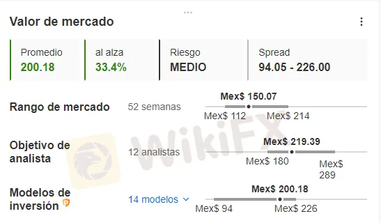 Si se considera el valor razonable de 200.18 pesos que otorga InvestingPro, basado en 14 modelos financieros, los títulos de OMAB presentan una infravaloración de 33.4%; sin embargo, al considerar el precio objetivo medio de los 12 analistas que siguen a la emisora, de 219.39 pesos, las acciones se estarían negociando un 46.2% por debajo de su valor.