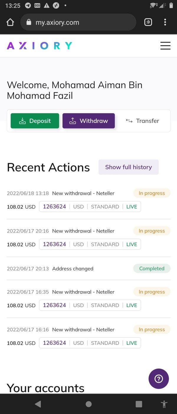 My withdrawals with Axiory have been stuck as ‘In progress’ for days, even though deposits go through instantly. This clearly shows how easy they make it to put money in, but when it comes to taking money out, they delay or block it. Very unprofessional and frustrating experience.
