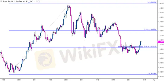 Sa chart sa ibaba, tinitingnan namin ang panghabambuhay na paglipat sa EUR/USD , na kumukuha ng mababa sa taong 2000 hanggang sa pinakamataas noong 2009. Magsisimula kami sa simula ng paglipat at iguhit ang retracement sa itaas, at 38.2 % ng way-down ay makikita natin ang retracement sa 1.3056. Makikita rin natin ang 61.8% retracement ng paglipat na ito sa 1.1212. Pansinin kung paano nakatulong ang level na ito na magtakda ng paglaban sa pares sa loob ng 15 sa 30 buwan pagkatapos maglaro ang level noong Enero ng 2015. Habang ang EUR / USD ay bumabagsak na parang bato sa pag-asam ng ECB QE na mag-online sa loob ng ilang maikling buwan, nakakuha kami ng suporta sa antas na ito habang pababa noong Enero ng 2015; ngunit pagkatapos noon ay nagkaroon kami ng walong magkakasunod na buwan ng paglaban na nagpapakita sa o sa paligid ng mahalagang 61.8% na antas ng retracement na ito.
