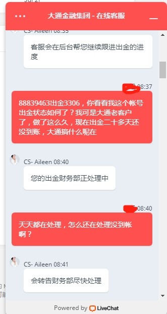 我在大通金融很多年了,也是老客户,有俩账户,88839463出金3306美元在18号扣款后到现在不到账,账户88841182出金10165美元在15号扣款后也一直不到账,本人本来寄予希望大通早点给我解决,可是一直给我压着不给出金,本人无法再忍受直接曝光大通的恶意不给出金恶行