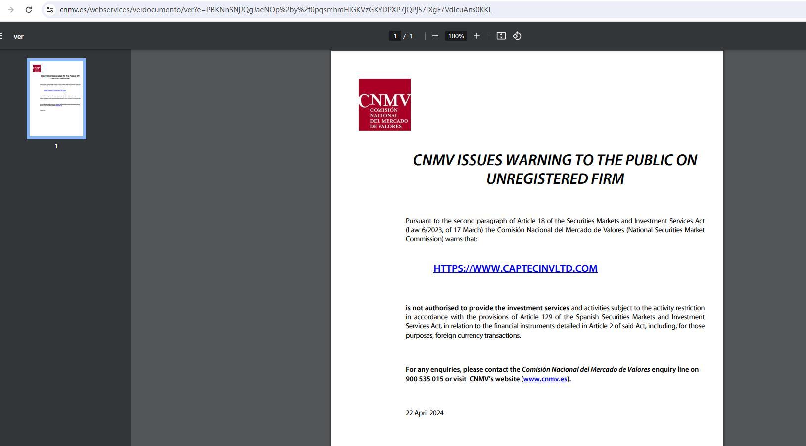 - Raison de la punitionhttps://www. CAPTECINVLTD.COM n'est pas autorisé à fournir les services et activités d'investissement soumis à la restriction d'activité conformément aux dispositions de l'article 129 de la loi espagnole sur les marchés de valeurs mobilières et les services d'investissement.