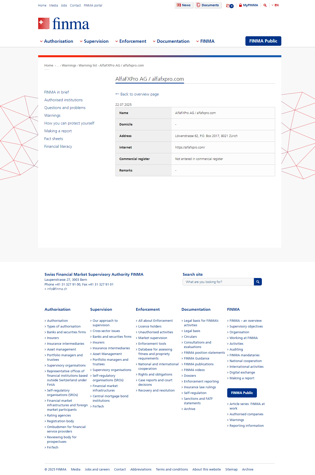 Liste d'avertissement des entreprises et individus non autorisés Avertissement public Liste d'avertissement des entreprises et individus susceptibles de fournir des services non autorisés et non supervisés par FINMA AlfaFXPro AG / alfafxpro.com.