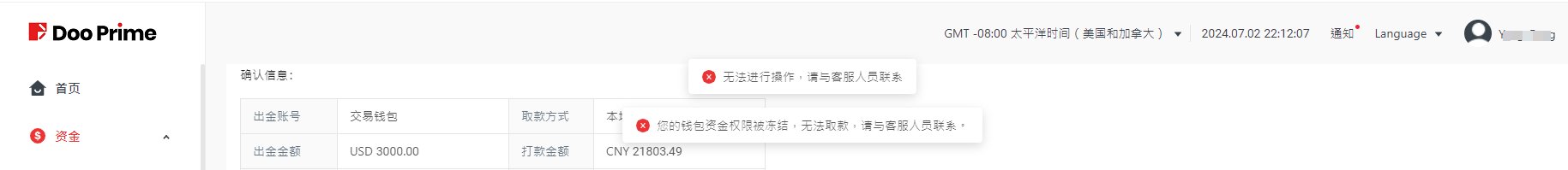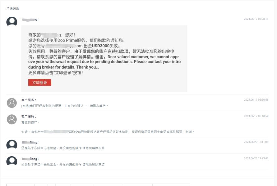 本人6月12号在 Doo Prime德璞资本提现出金,一直不给审核通过,直到6月19号通过客户经理说是我这边订单涉嫌违规,利用报价缺陷,漏洞进行不当获利,直接冻结我资金,而且还要另外扣除我7022.65USD。 所有交易都是正常操作,之前因为卡盘滑点有爆仓了也不说平台原因给我赔付,有收益了却说我违规交易,平台的吃相也太差了!而且后面一直联系不给任何回复。