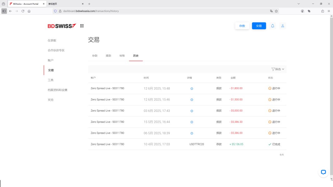 我在BDSwiss(原网址mau.bdswiss.com和https://eu.bdswiss.com/zh/)平台开设的MT4账号是50311780,我在2025年4月10日入金5136.05美金,总共盈利250.25美金,我于2025年4月14日提交5386.3美金出金, 直到今天(2025年7月17日)仍未收到本人的本金和盈利。 近日我联系上该公司的原客户经理Mrs.Right,了解到该公司正面临倒闭的风险,很多原来的员工工资也是拖了很久才给。 因此我在这里想要请求外汇天眼的帮助,能不能把本金5136.05美金退还给本人?我可以不要盈利,只要要求BDSwiss公司能够退还我的本金就行。