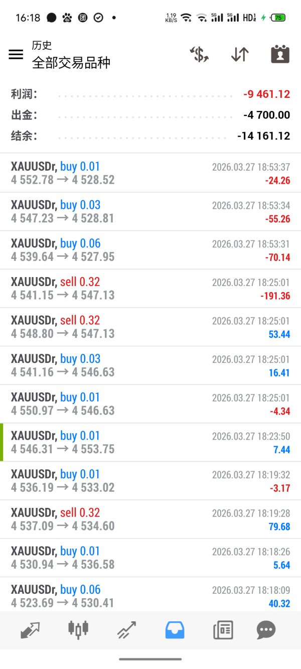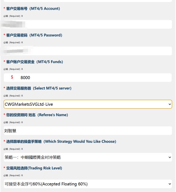 交易过程中被平台CWG合作机构擅自修改风控、策略逻辑,2026年3月24日客户(交易者)签订的风控为8000美金接受最大浮亏为60%,被机构擅自修改为100%,签订量化程序为稳健型策略一黄金对冲。由于平台CWG合作机构的擅自修改,导致2026年3月27日交易过程中净值10000多美金的账户被修改参数,开仓手数加大,补仓间距加密,被强制平仓,风控达100%,亏损9461美金。