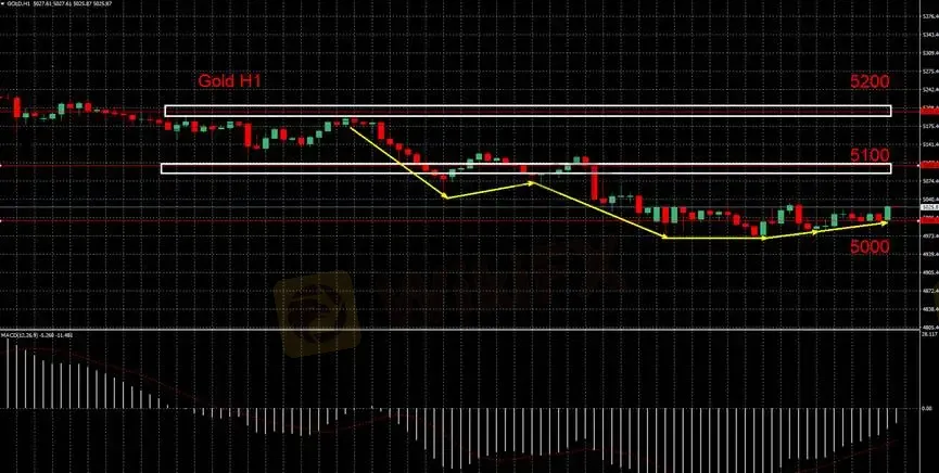 Saat ini harga bergerak dalam kisaran sempit 5000–5030, menandakan adanya minat beli di sekitar level psikologis tersebut. Namun secara keseluruhan, struktur pasar masih berada dalam fase konsolidasi rendah dalam tren menurun.
