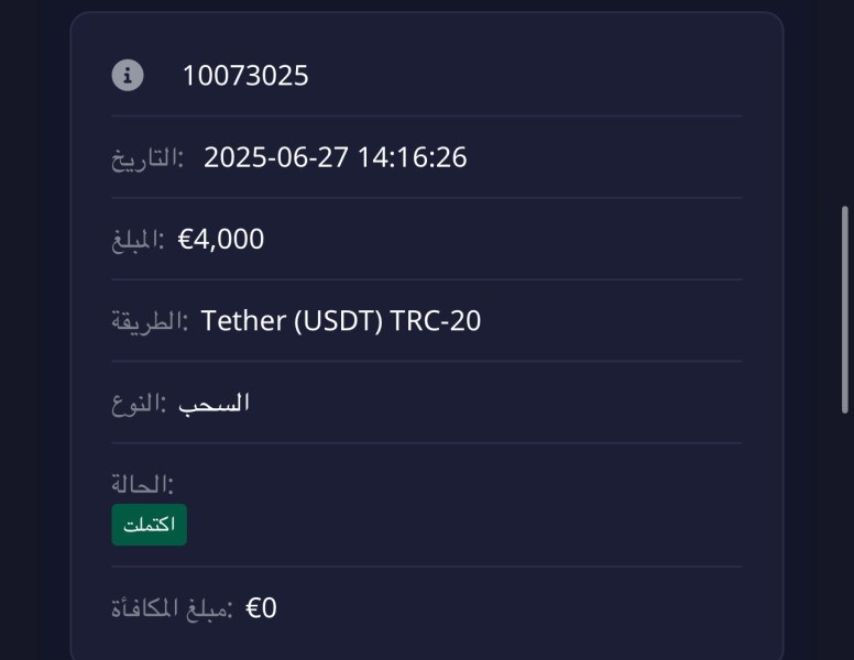 لقد سمعت كتير من تعليقات ال سلبية و كل مرة اعمل فيها ربح و اطلب اسحب اخاف ان لم يصل و ل حد لان ال سحب يصلني يطلبو توثيقات و اوثق و أمور تجري بي خير ل لان و أنا بي ربح كبير بعد ال شيئ هاذي تجربتي ل حد لان ممتاز ولاكن ال سحب عندما تكون بي ربح يطول و ليس كما عندما تكون في خسارت يصل ال سحب في ٥ دقايق ولأن يصلني ال سحب في اربع ايام