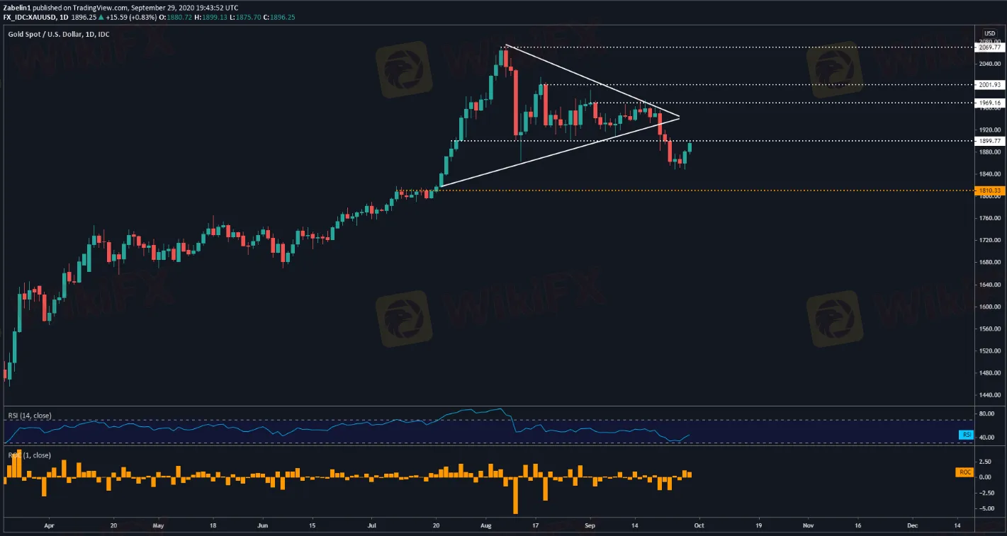 WikiFX Notizie (30 settembre) - Il 29 settembre, ora locale, gli Stati Uniti hanno tenuto il loro primo dibattito sulle elezioni presidenziali nel 2020 e il mercato era nell'incertezza; Inoltre, i due partiti degli Stati Uniti stanno ancora discutendo sul piano di stimolo fiscale, influenzato da questo, il prezzo dell'oro sta testando un'importante resistenza a 1897,77.
