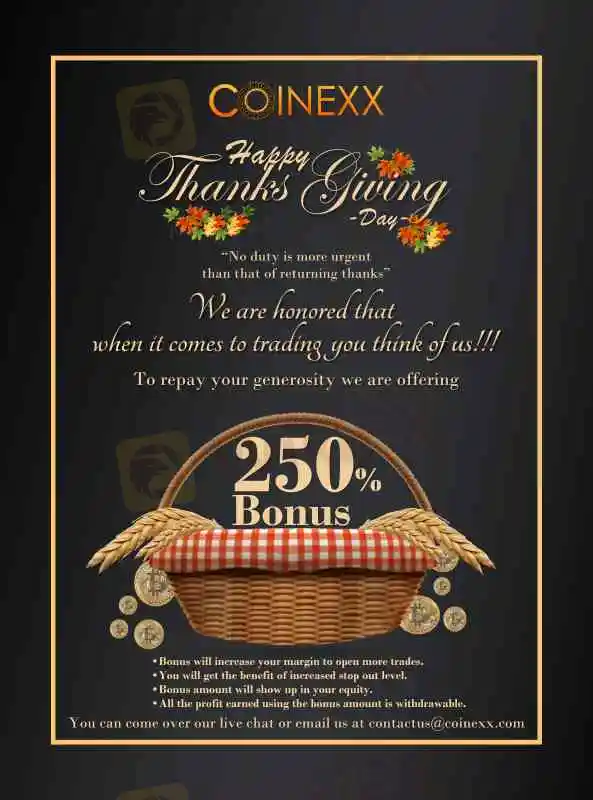 概要:coinexxが 250%ボーナス特典を感謝祭に実施予定です。