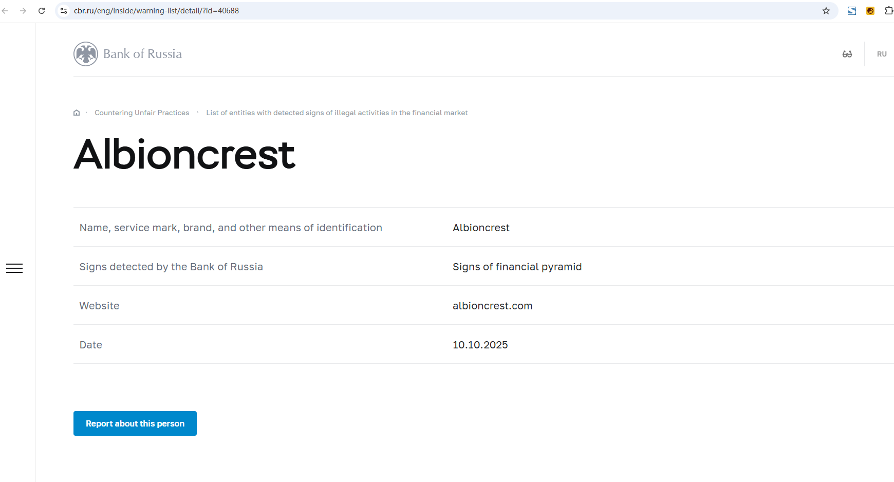 名称、サービスマーク、ブランド、その他の識別手段 Albioncrest ロシア中央銀行が検出した兆候 金融ピラミッドの兆候 ウェブサイト albioncrest.com 日付 10.10.2025