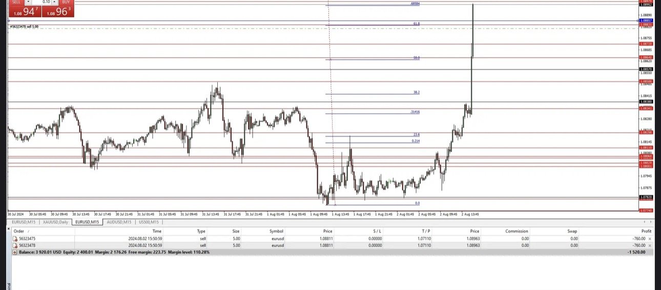 I opened a 16 lot short position in the EURUSD. This was made up of two 5 lot positions and one 6 lot position. I calculated my sizing so that my 20% automatic stop out would only be triggered if the market breached 1.0904. However, as shown in my screenshots, the market closed my 6 lot short position out at 1.08922. At this level in the EURUSD, my margin level would only be 75%, well above the 20% automatic stop out level. This is quite concerning as I am not being offered the leverage I thought I had, namely 500:1 with automatic stop out at 20%.