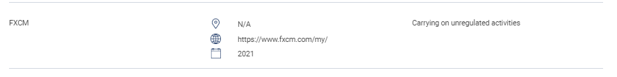 «данный раздел содержит список неавторизованных веб-сайтов, инвестиционных продуктов, компаний и частных лиц. В этот список входят: лица, осуществляющие или выдающие себя за осуществление следующих регулируемых видов деятельности без лицензии SC: операции с ценными бумагами; операции с деривативами; управление фондами, консультирование по корпоративным финансам, консультирование по инвестициям, финансовое планирование и участие в частных пенсионных схемах, лица, работающие на признанном рынке без разрешения, лица, выпускающие или предлагающие ценные бумаги без одобрения, разрешения или признания, лица, злоупотребляющие логотипом sc и представляющие ее в ложном свете. " FXCM нет https://www. FXCM .com/my/ 2021 ведение нерегулируемой деятельности