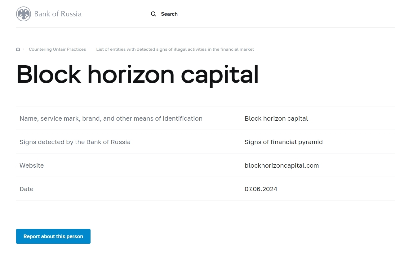 Список субъектов с выявленными признаками незаконной деятельности на финансовом рынке Block horizon capital.
