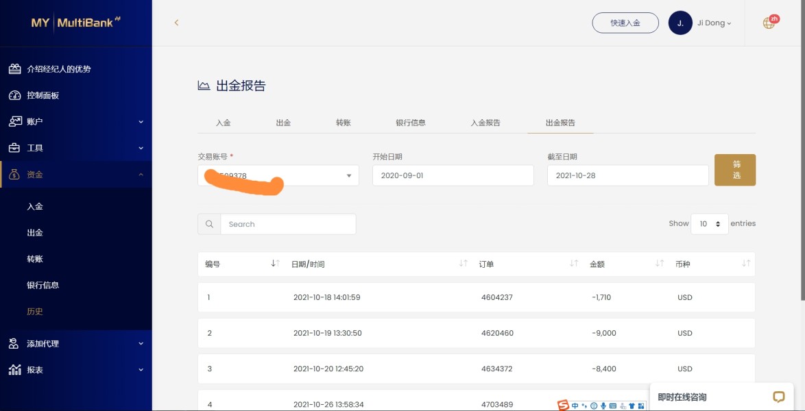 出金记录,平台扣款记录,但一直不到账,我的朋友10月19日出金,也一直没到账,mt4账户已经扣款扣成0了,但就是不到账。