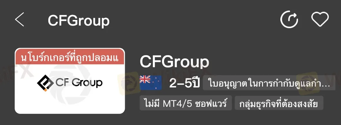 โบรกเกอร์ CFGroup อ้างว่าถือใบอนุญาตจาก 2 หน่วยงานดังอย่าง ASIC ของออสเตรเลีย และ FSPR ของนิวซีแลนด์ แต่ขณะนี้ถูกประกาศสถานะแล้วว่าอาจถือ ‘ใบอนุญาตปลอม’ ถือว่าไม่มีการควบคุมดูแลอย่างมีประสิทธิภาพ ทำให้มีคะแนนจากแอป #WikiFX ลดลงไปเหลือเพียง 1.40/10 เท่านั้น โปรดระวังความเสี่ยงที่อาจจะเกิดขึ้น