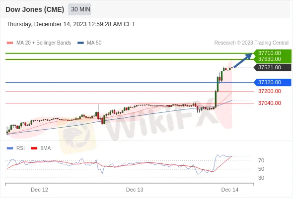 เมื่อวันพุธ หุ้นสหรัฐฯ พุ่งขึ้นหลังจากธนาคารกลางสหรัฐบอกเป็นนัยว่าจะลดอัตราดอกเบี้ยในปี 2567 ดัชนีเฉลี่ยอุตสาหกรรมดาวโจนส์ทะลุระดับ 37,000 เป็นครั้งแรกในประวัติศาสตร์ โดยดีดตัวขึ้น 512 จุด (+1.40%) มาอยู่ที่ 37,090 ซึ่งสูงเป็นประวัติการณ์ ปิด.