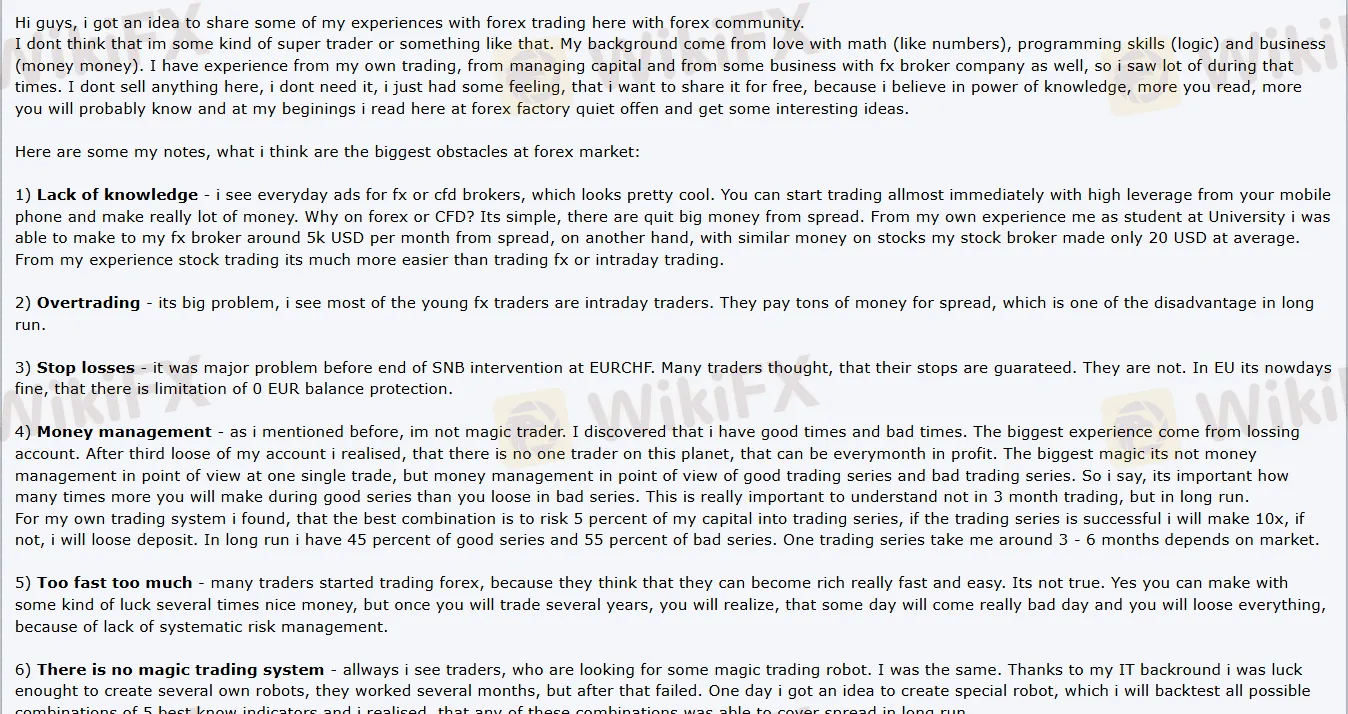 เขาเล่าว่า สาเหตุที่เลือกมาแชร์ประสบการณ์ใน Forex Factory ก็เพราะในช่วงเริ่มต้น เขาเองก็เป็นหนึ่งในคนที่เคยเรียนรู้จากชุมชนแห่งนี้ และได้รับไอเดียดี ๆ มากมายจากการอ่านประสบการณ์ของคนอื่น