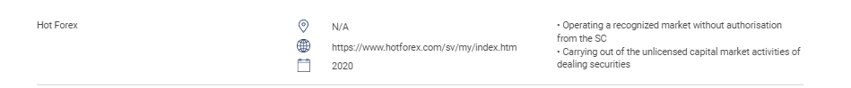 "ส่วนนี้ประกอบด้วยรายชื่อเว็บไซต์ ผลิตภัณฑ์การลงทุน บริษัท และบุคคลทั่วไปที่ไม่ได้รับอนุญาต รายชื่อนี้ประกอบด้วย: บุคคลที่ดำเนินหรือถือตัวว่าดำเนินกิจกรรมที่มีการควบคุมต่อไปนี้โดยไม่ได้รับอนุญาตจาก SC: การซื้อขายหลักทรัพย์ การซื้อขายตราสารอนุพันธ์ การจัดการกองทุน การให้คำปรึกษาทางการเงินขององค์กร การให้คำปรึกษาด้านการลงทุน การวางแผนทางการเงิน และการจัดการโครงการเกษียณอายุส่วนตัว บุคคลที่ดำเนินการในตลาดที่เป็นที่ยอมรับโดยไม่ได้รับอนุญาต บุคคลที่ออกหรือเสนอขายหลักทรัพย์โดยไม่ได้รับอนุญาต อนุญาต หรือรับรอง บุคคลที่ใช้โลโก้ของ SC ในทางที่ผิดและบิดเบือนความจริงของ SC " Hot Forex N/A https://www.hotforex.com/sv/my/index.htm 2020 • ดำเนินการในตลาดที่ได้รับการยอมรับโดยไม่ได้รับอนุญาตจาก SC • ดำเนินกิจกรรมตลาดทุนที่ไม่ได้รับอนุญาตในการซื้อขายหลักทรัพย์