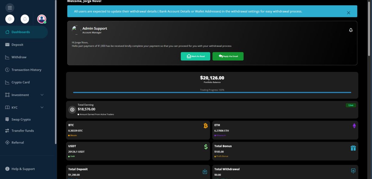 Este Brokers me contacto en nombre de otra persona a la cual yo sigo prometiendo que si depositaba 200 dollares en 72 horas ganaria 1200.00 eso estaba aceptable pero cuando llegaron las 72 horas ya no solo habia 1200.00 si no 18,000. $ entonces para poder retirarlo habia que pagarles el 10% era su comicion cuando les dije que si se los pagaria cuando efectuara el retiro me dijeron que primero necesitaba hacer el depocito del 10 % esta pagina es ina estafa