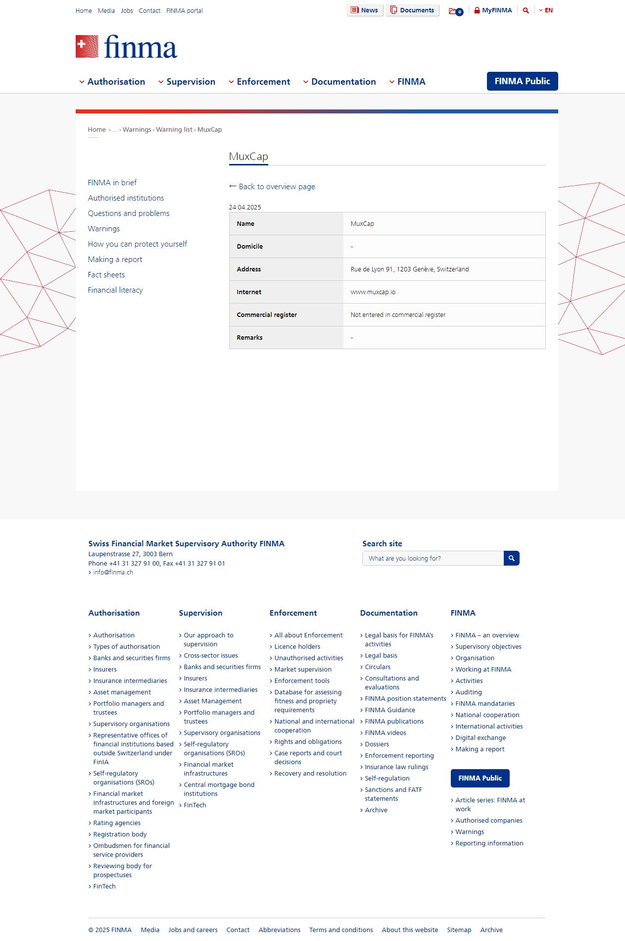 Yetkisiz şirketler ve bireylerin uyarı listesi Kamu uyarısı FINMAMuxCap tarafından denetlenmeyen ve yetkisiz hizmetler sunuyor olabilecek şirketlerin ve bireylerin uyarı listesi.