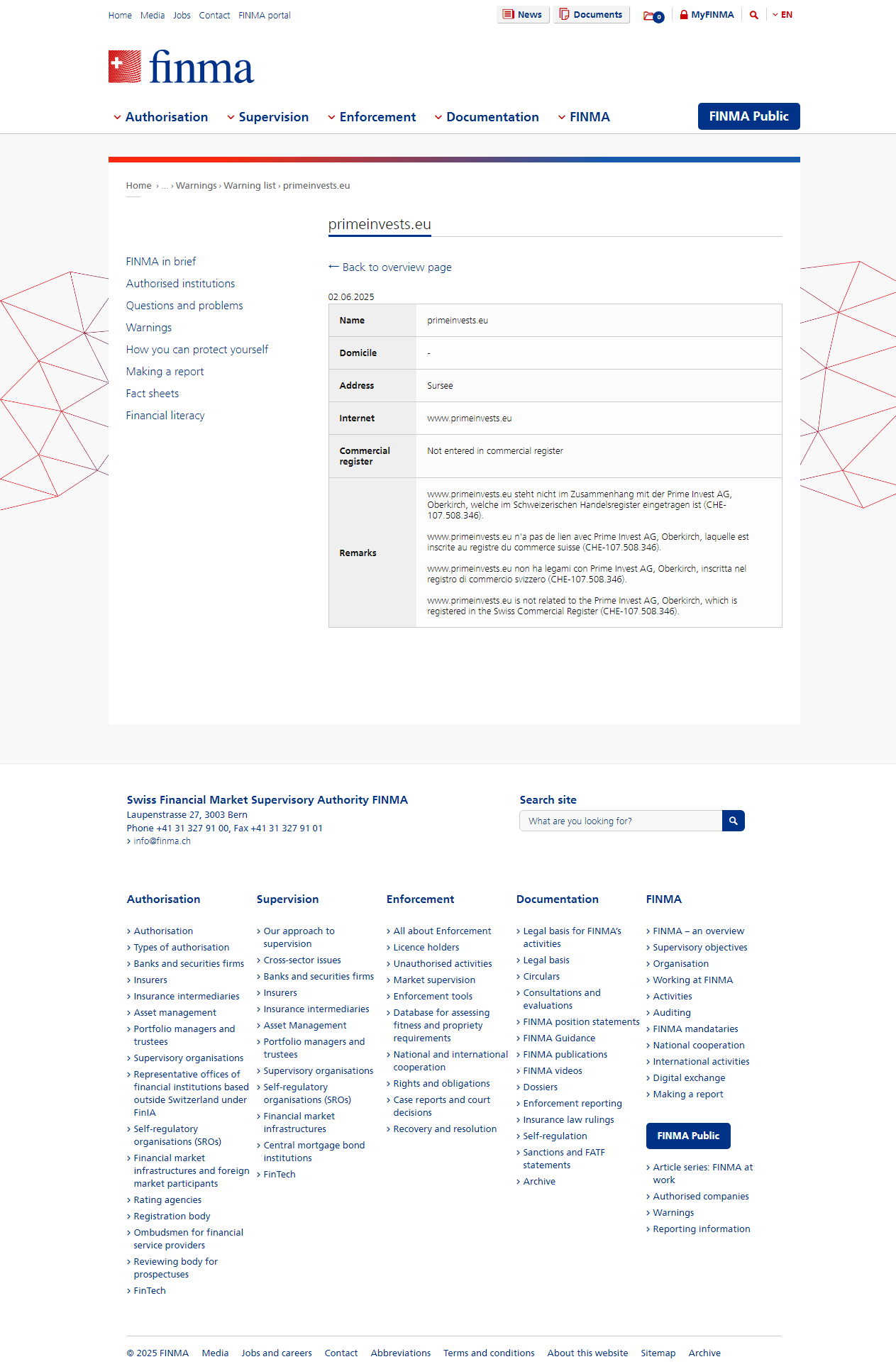 Yetkisiz şirketler ve bireylerin uyarı listesi Kamuya açık uyarı FINMA tarafından denetlenmeyen ve yetkisiz hizmetler sunmuş olabilecek şirketler ve bireylerin uyarı listesi primeinvests.eu.