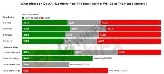 Dưới đây là chỉ số tâm lý bò/gấu của AAII tính đến ngày 03/09. Chỉ số này phản ánh tâm lý lạc quan hay bi quan của nhà đầu tư cá nhân. Khi thị trường tiếp tục lập đỉnh, tâm lý bi quan của nhà đầu tư nhỏ lẻ lại gia tăng, từ 39,4% lên 43,4%. Hiện tại, thị trường đang ở trạng thái “ép bán khống” hoặc “ép người đứng ngoài tham gia”. Đến khi nhà đầu tư cá nhân đồng loạt chuyển sang xu hướng mua, chúng tôi cho rằng đà tấn công của phe mua sẽ tạm dừng.