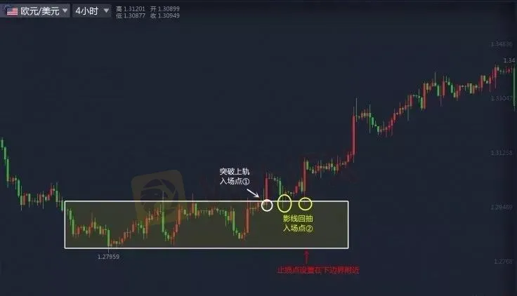 要特别注意的是,在箱形区间里,价格突破后数日内通常会回抽至压力或支撑线附近测试突破是否成功,期间至少会出现一次以上的假突破。此类回抽的概率高达40%,通常出现在突破后的三天或三周内,这意味着首次突破进场面临亏损的风险较大,所以做好止损至关重要。