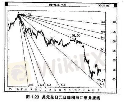 江恩角度线是用来预测未来价格走势的支撑和压力线。它表明市场的空间与价格、空间与时间存在的某种数学关系。其中,最为重要的是为1X1角度线,代表市场1个单位时间等于1个单位价格。表示时间与价格在此达到平衡。若个股处于1X1角度线之上,我们可以认为该股处于强势区。否则位于1X1角度线之下,则认为是处于弱势区。