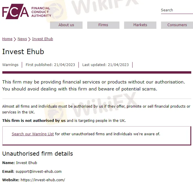 FCA警告称:Invest Ehub 在未经我们授权的情况下在英国提供金融服务或产品,如果一旦遭受资金损失,您将无法使用金融申诉专员服务或受到金融服务补偿计划 (FSCS) 的保护。