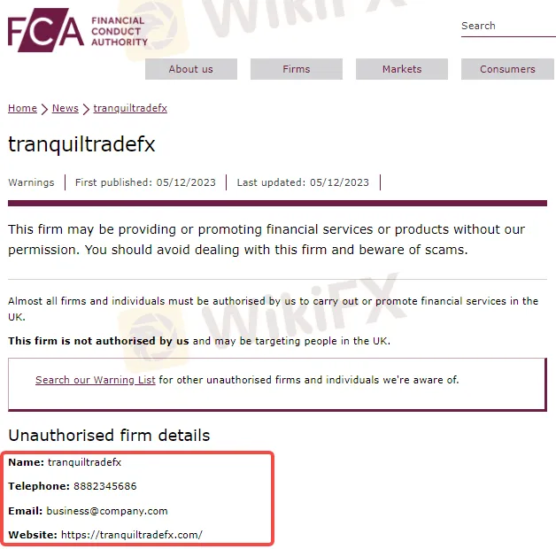 FCA认为tranquiltradefx存在欺诈投资者、非法集资等严重违法行为的可能。并警告投资者不要与该公司进行任何交易或投资,如果一旦遭受资金损失,将无法使用金融申诉专员服务或受到金融服务补偿计划 (FSCS) 的保护。