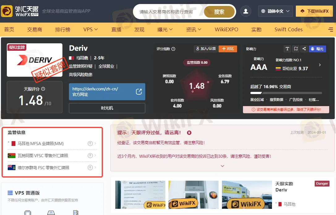 所以选择受到监管机构监管并持有监管牌照的外汇交易商可以提供更多的安全保障和信心,有助于投资者在外汇市场中更加安全地进行交易。投资者在选择外汇交易商时,应该优先考虑其监管情况,并确保选择受到信誉良好的监管机构监管的合规交易商。但是需要注意Deriv虽然宣称受到马耳他金融服务局(MFSA)、瓦努阿图金融服务委员会(VFSC)以及维尔京群岛金融服务委员会(FSC)监管,持有马耳他金融服务局(MFSA)全牌照(MM)、瓦努阿图金融服务委员会(VFSC)零售外汇牌照以及维尔京群岛金融服务委员会(FSC)零售外汇牌照。但是经过外汇天眼鉴定中心鉴定,均显示为疑似套牌。