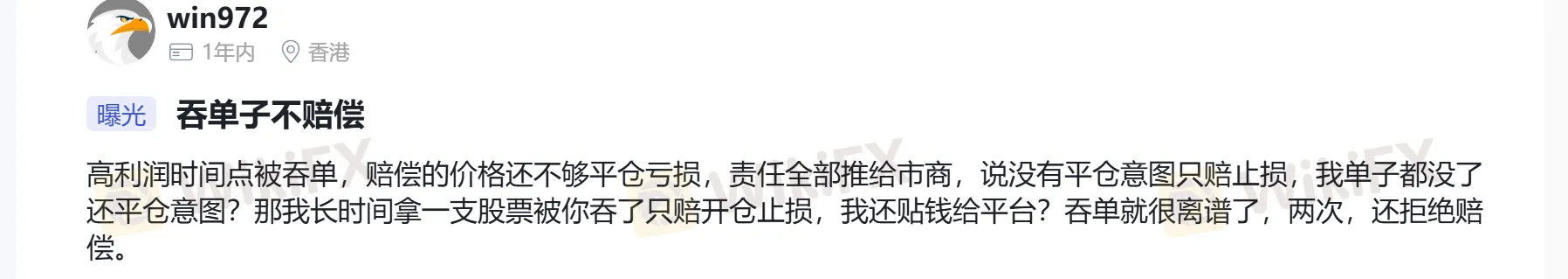 一位香港用户“win972”在外汇天眼曝光VSTAR平台,称在该平台买股票打算长时间拿着被强平,平仓价比当日最低价还低43%。“高利润时间点被吞单,吞单就很离谱了,(一天吞)两次,还拒绝赔偿”。